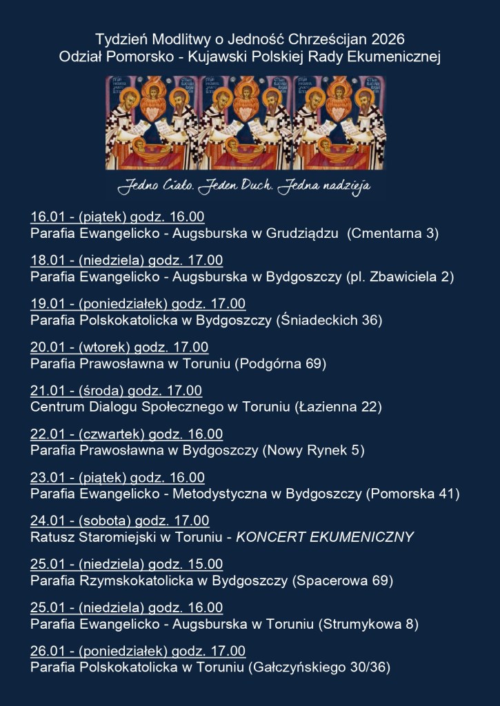 Zapraszamy do udziału w wydarzeniach tegorocznego Tygodnia Modlitw o Jedność Chrześcijan. W naszym kościele ekumeniczne spotkanie odbędzie się w niedzielę 18 stycznia o godz. 17.00, podczas którego wystąpią: Bydgoski Chór Ewangelicki Pro Domini oraz organista Marek Przywarty.